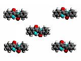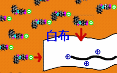 | 今回の染料は、オレンジIIという名前で、その分子は、マイナスの電気を帯びている(陰イオンである)。図には、分子一粒一粒が、水の中に散らばっている様子を示した。 染料液に布を入れると、染料水溶液は繊維の中にしみ込み、染料分子は繊維の分子と繊維の分子の間に入っていく。図では、布の中にある繊維の分子の1本を黒い線で示した。 |
