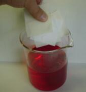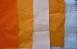 | オレンジIIという染料の水溶液に、羊毛・絹・木綿・ナイロン・アクリルの5種類の布をしばらく浸す。染料水溶液が布にしみ込んでおり、どの布もオレンジ色に染まったかに見えるが、よく水洗いすると、、、。 | 染色結果:左から、羊毛・絹・木綿・ナイロン・アクリル。羊毛・絹・ナイロンやよく染まった。木綿は、うっすらと色がついただけ。アクリルは全く染まっていない。 |