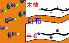 繊維の分子にプラスの電気を帯びた部分があると、マイナスの電気を帯びた染料の分子は、プラスとマイナスの結合、即ちイオン結合で結合する。このような結合が起こるので、染料の分子は水溶性であるにもかかわらず、洗っても繊維から流れ出ない。つまり染色された、染着した、ということになる。 | 羊毛や絹やナイロンの繊維の分子には、プラスの電気を帯びた部分があるので、左の図のように、マイナスの電気を帯びた染料の分子と結合できるが、木綿の分子は、プラスの電気を帯びた部分はあるものの、弱い(上図では、小さな+で表現)ので、染料の分子を引き止めておくことができず、洗うことで染料が流れ出てしまう。アクリルの繊維の分子は、プラスを帯びた部分が無いので、染料分子を結合させることができない。 |