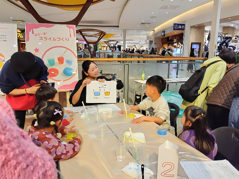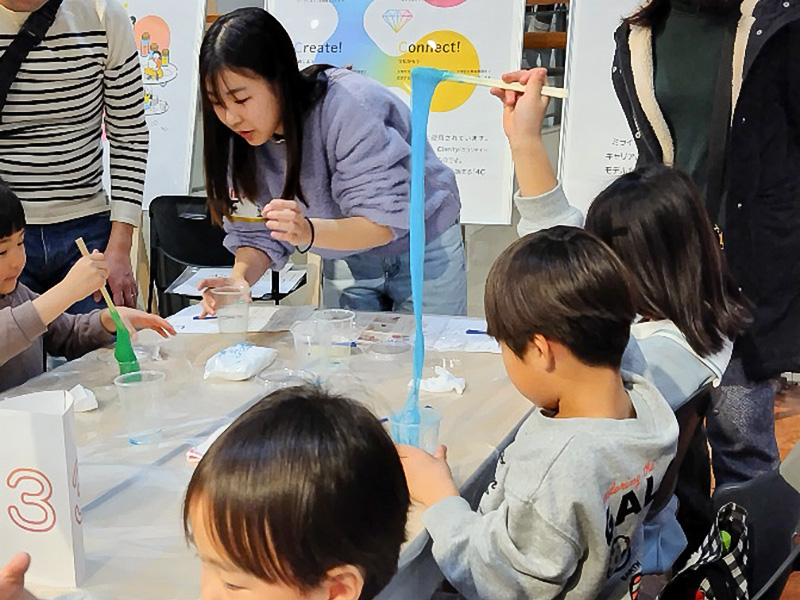 社会情報学科和泉ゼミの学生たちにより「きらきら偏光板ホルダー」「のびーる!スライム」の2種類のワークショップを実施しました。「きらきら偏光板ホルダー」は、偏光板を使って目に見えない光の向きがカラフルな色になって見えたりするというもので、また、「のびーる!スライム」は、洗たく糊とホウ砂水を混ぜていくと、だんだんひとつに固まる、というものです。光のフシギ・固まるフシギをわかりやすく紙芝居で説明し、科学実験さながら真剣に、また楽しく作業ができました。