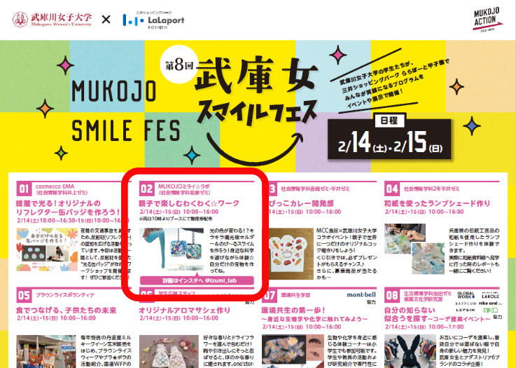 武庫川女子大学、三井ショッピングパーク、ららぽーと甲子園の合同イベント「武庫女スマイルフェス」において、2月14日(土)、15日(日)の両日、MUKOJOミライ☆ラボ「親子で楽しむわくわく☆ワーク」を実施しました。