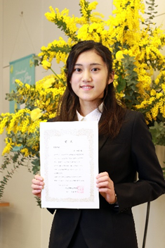 第Ⅱ部は、投稿原稿の受賞者表彰式を行いました。フォーラム開催に際し、事前に本学学生・大学院生及び附属中学校・高等学校生徒を対象に、「自分の生涯キャリアデザインを考えよう」をテーマとした原稿募集を行い、事前の審査を経て当日は各部門3名、計6名の受賞者たちが投稿原稿のスピーチを行い、女性活躍総合研究所の高橋所長より表彰されました。