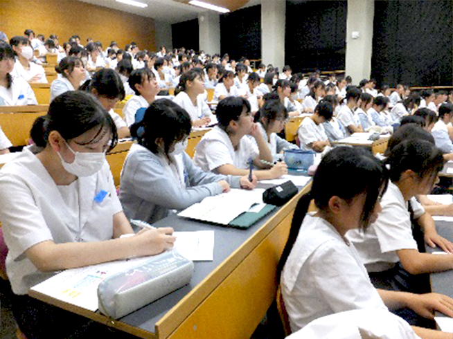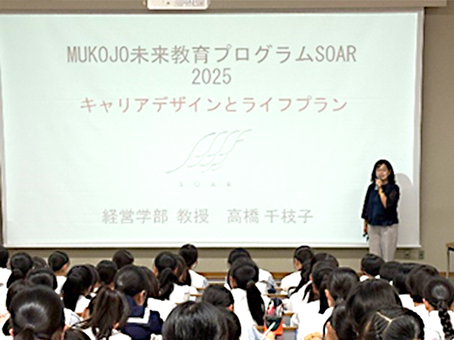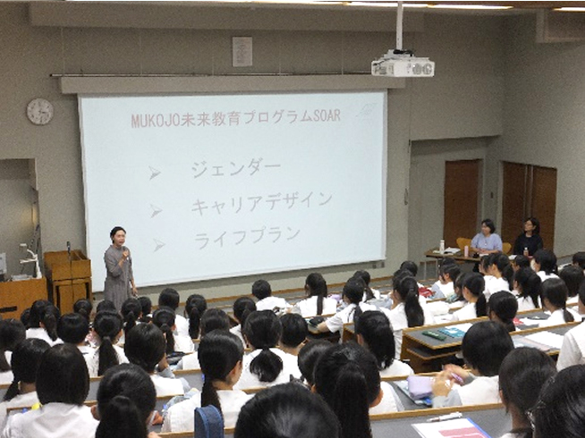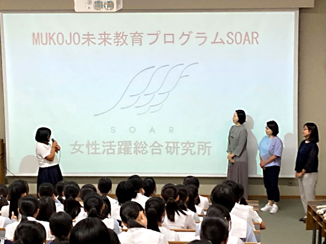 昨年に引き続き、10月9日(木)武庫川女子大学附属中学・高等学校にて高校1年生(約230人)を対象に「MUKOJO未来教育プログラムSOAR」導入講義を行いました。令和4年より大学入学直後の1年生におこなっている導入講義を、昨年より附属中高の課程「SOARグローバルサイエンスコース」と「SOAR探求コース」の2コースにおいても実施しています。生徒からのアンケート回答には「SOARに込められた意味を理解し、よりいっそう学習に取り組もうと思いました」「自分らしさを大切にして、生かしていきたいと思いました。」「思い込みやイメージにとらわれないようにしようと思った」等の感想がありました。