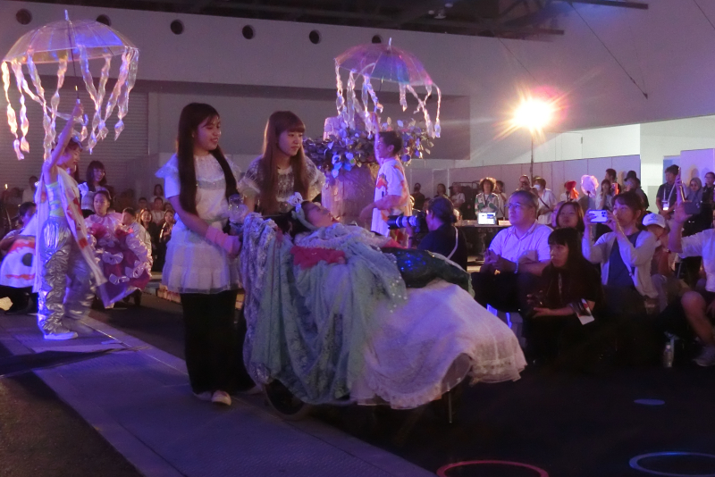 このイベントは「介護×障がい×LGBTなど多様な社会をカワイイ・タノシイ・オイシイから相互理解する」ことを目的として、ファッションショーをはじめ、ユニバーサルデザインに関する展示・体験・販売など多彩な内容で開催されています。本学学生の参加は昨年に続き2回目。卒業生の一般社団法人カワイク介護代表理事・楠本あやさんの協力依頼により、生活環境学科・生活造形学科の学生と山本泉教授が昨年からファッションショーのボランティアに携わっています。