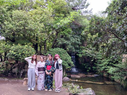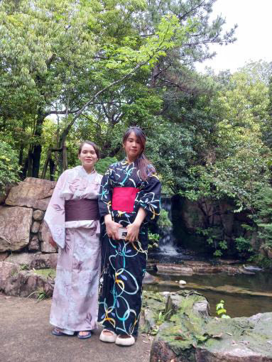 原口さんと吉田さんにゆかたを着せてもらったベトナムからの技能実習生2人は「思ってもみない体験ができた」と喜び、「こくさいひろば芦屋」の近くの公園で互いのゆかた姿を撮影していました。