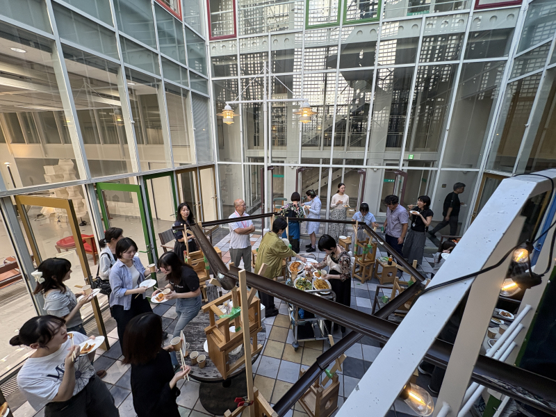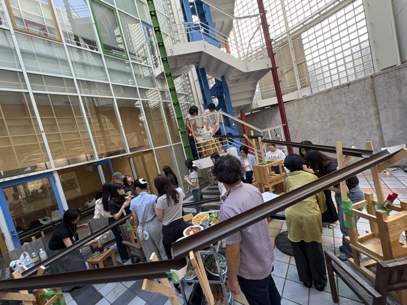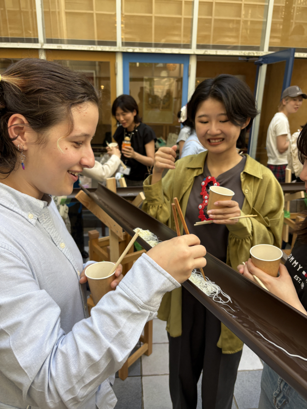 歓迎会は、生活環境学科の学生が中心となり、フランシスカさんと日本人学生との交流機会を創出するとともに、2024年度に多田ゼミを中心に始まった空間活用プロジェクト『チカフェ』をさらに盛り上げることを目的として、学科の中庭を活用した「流しそうめん」が行われました。当日は非常に多くの学生が参加し、流しそうめんを楽しみながら、フランシスカさんの専攻であるファッションの話で大いに盛り上がり、友好を深めました。