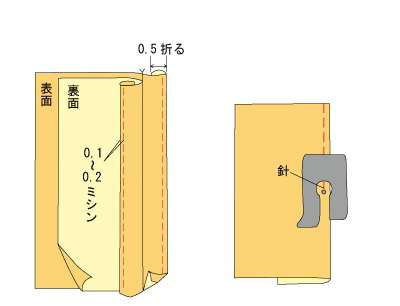 綿、麻、化合繊などほつれにくく、あまり厚い布でない縫い代の始末の方法。 縫い代幅を決めて布端をアイロンで0.5cm折り、縫い代の表面から縫い代だけに、折った端から0.1~0.2cmのところにミシンをかける。 裁ち端の処理を目的とした端ミシンでは返し縫いの必要はない。