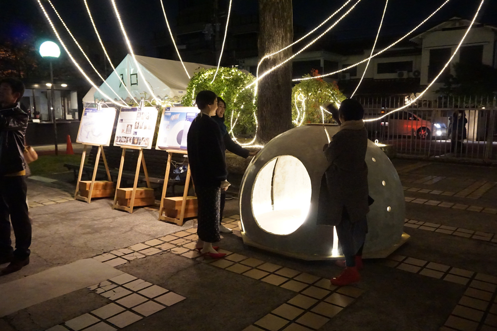| 以前から、甲子園会館西側広場には「紙管ゲル」、建築スタジオ前庭園には「鋁ノ塔(テンセグリティによる構築物)」とレシプロカル構造を展示していました。2018年(平成30年)のライトアップでは、これらに加えて、東ウィングのスタジオ1(甲子園ホテル時代は大食堂)前の南庭園に「耀(KAGUYA)」を、正門入口のジャンボクリスマスツリー下にはシェル構造による空間建築を展示しました。これらはいずれも大学院建築学専攻の学生が制作したもので、ライトアップでは照明を施しました。 | |