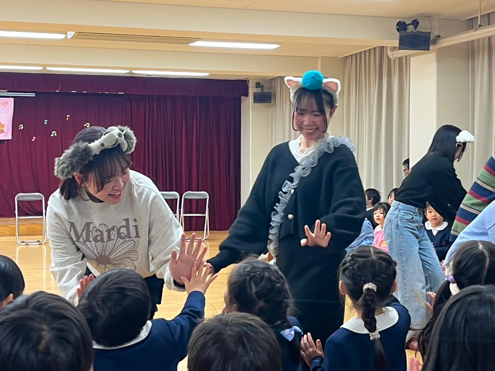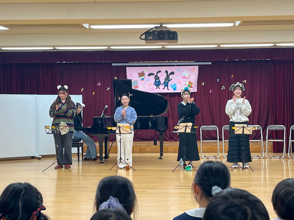 1月15日(木)、応用音楽学科 「生涯学習関係論Ⅱ」(担当:西野桂子非常勤講師)受講生が、授業の一環として今年も武庫川女子大学附属幼稚園でコンサートを開催しました。 「ホールニューワールド」や「ぼよよん行進曲」などを演奏し、園児たちは鈴やタンバリンで一緒に演奏に参加しました。楽しい時間を過ごすことができ、学生にとって貴重な経験となりました。