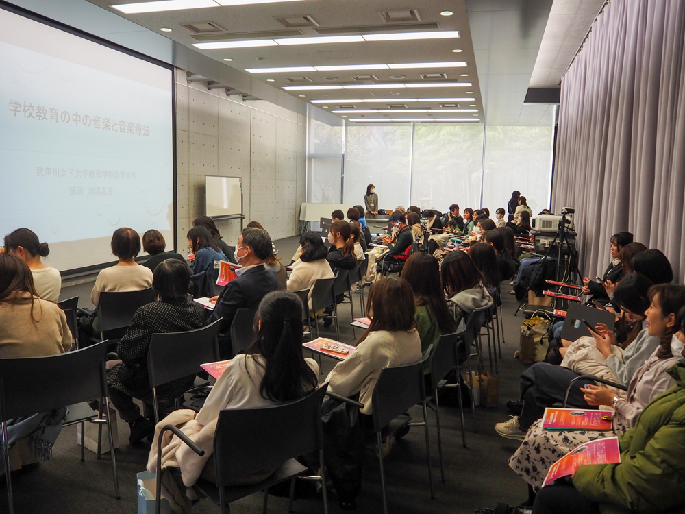 2026年2月14日(土)13時30分から第15回音楽療法講演会(音楽学部/附属総合ミュージアム共催)を開催しました。今回は、音楽療法士である渡邊真美本学教育学科講師による「子どもの音楽療法-学校教育の中の音楽と音楽療法-」がテーマ。学校教育現場における長年の実践から、特別支援教育に携わる音楽の教師の役割をはじめ、特別支援教育(知的障害)の音楽の教科書にはすでに音楽療法のエッセンスが盛り込まれていることについて紹介されました。