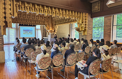 環境共生学部のプロジェクト棟は環境との調和、地域資源の活用、快適さを意識した特別な建物です。ツアーでは、プロジェクト棟の秘密をご紹介しながら、展示や研究室、充実した学生生活のための施設を巡ります。ゴールはラボワーク体験のための研究室にご案内します。